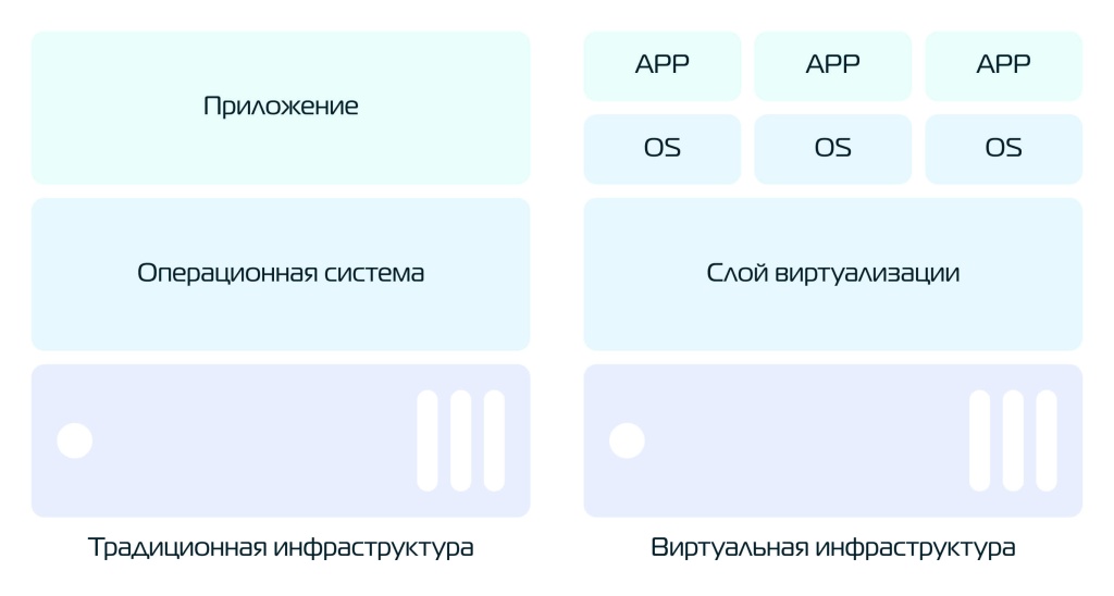 Ключевое преимущество виртуализации — высокая утилизация ресурсов. Традиционная инфраструктура использует примерно 15–20% мощностей каждого сервера. Виртуализация доводит этот показатель до 70–80%. Она абстрагирует вычислительные мощности от физического оборудования, позволяет создать несколько изолированных виртуальных сред и на каждой запускать несколько виртуальных машин. Каждая такая машина обладает своей операционной системой и вычислительными ресурсами.