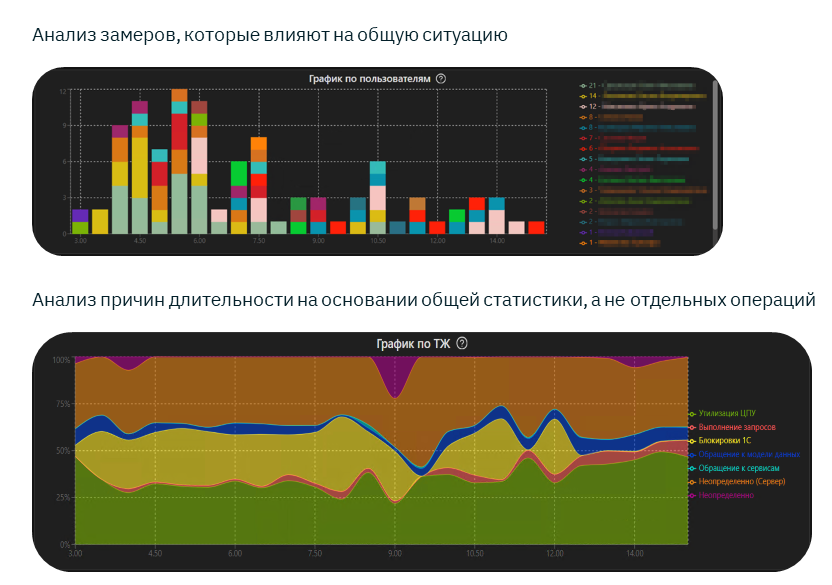 Важно отметить, что данный анализ выполняется не только на основе событий технологического журнала, но и с привлечением дополнительных данных из журнала регистрации. Такой расширенный подход, объединяющий информацию из нескольких источников по определенной логике, существенно повышает детализацию и точность проводимого анализа.