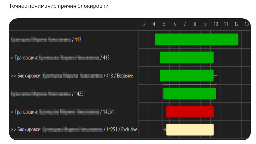 При исследовании проблемы производительности мы сосредоточились на анализе управляемых блокировок 1С. Хотя такие блокировки являются нормальным механизмом работы платформы, их доля в общем времени выполнения операций оказалась существенной. Для детального изучения мы выбрали операцию с характерным временем выполнения 10 секунд, где наблюдались значительные задержки из-за блокировок.