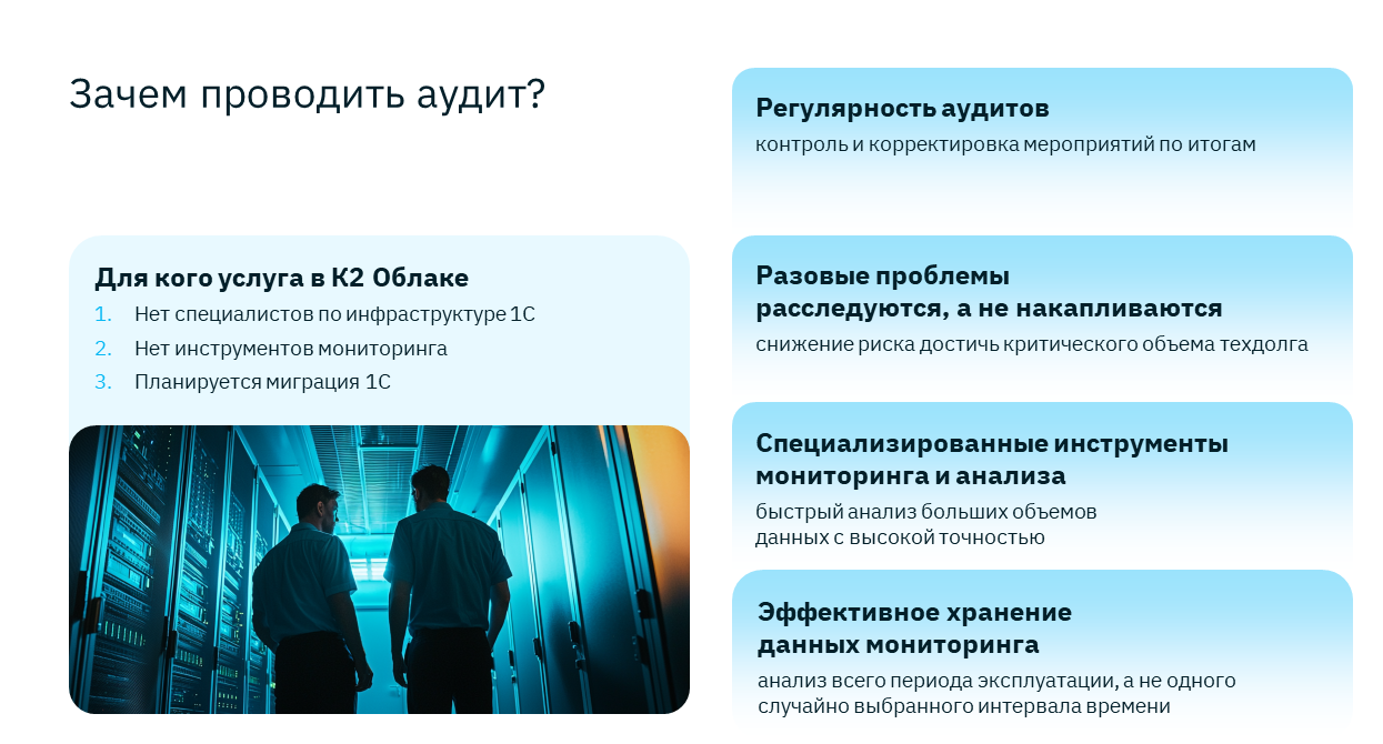 Мы проводим анализ технического состояния систем 1С и работы в облачных средах. Услуга предоставляется из К2 Облака, при этом предварительно настраивается сетевая связанность с местом расположения системы 1С заказчика.