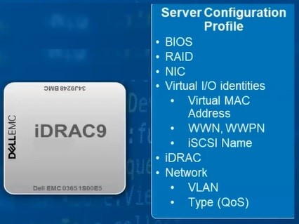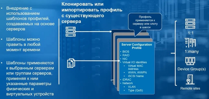 В каждом сервере есть специализированный контроллер удаленного управления сервером — конфигурационный файл, в котором хранится некий профиль сервера, т.е. описано состояние инфраструктуры. Server Configuration Profile (SCP) — конфигурационный файл в формате JSON или XML, который применяется к серверу вручную (через веб-интерфейс или CLI) или с использованием средств автоматизации. SCP можно получить через: