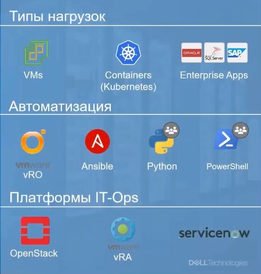 Мы поддерживаем интеграцию управления нашими серверами как с абсолютно разными типами нагрузок, включая контейнерную инфраструктуру, традиционную виртуализацию, так и с различными платформами для управления этой инфраструктурой и различными инструментами по автоматизации процессов управления.