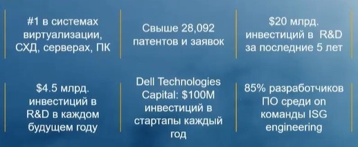 В настоящее время сложно найти людей и компании, которые редко пользуются продуктами Dell Technologies, потому что мы являемся лидером во всех областях ИТ-инфраструктуры и не только, в том числе в системах для виртуализации, конвергентных системах, серверах СХД и т. д. Наши инженеры, создающие новые продукты, имеют огромный опыт работы. Мы много инвестируем в разработку новых программных и аппаратных решений. Например, для разработки нового поколения серверов за последние пару лет мы подали свыше полутора тысяч патентов на различные технологии внутри Dell Technologies.