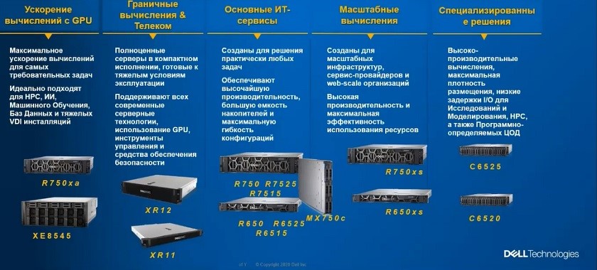 В нашем портфеле есть решения для большого количества задач и с различными вариантами компоновки внутренних ресурсов. Например, самый популярный сервер в мире, R750, позволяет построить с использованием различных компонентов свыше 70 000 абсолютно различных конфигураций, используя разные комбинации процессора, памяти, дисков, ускорителей, сетевых карт и других компонентов.
