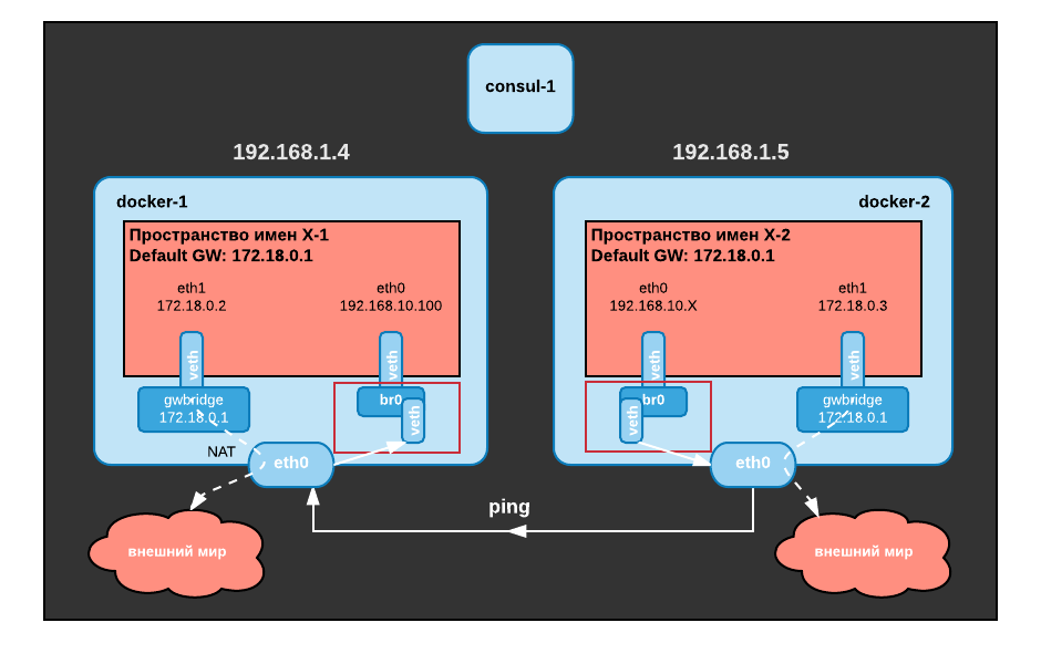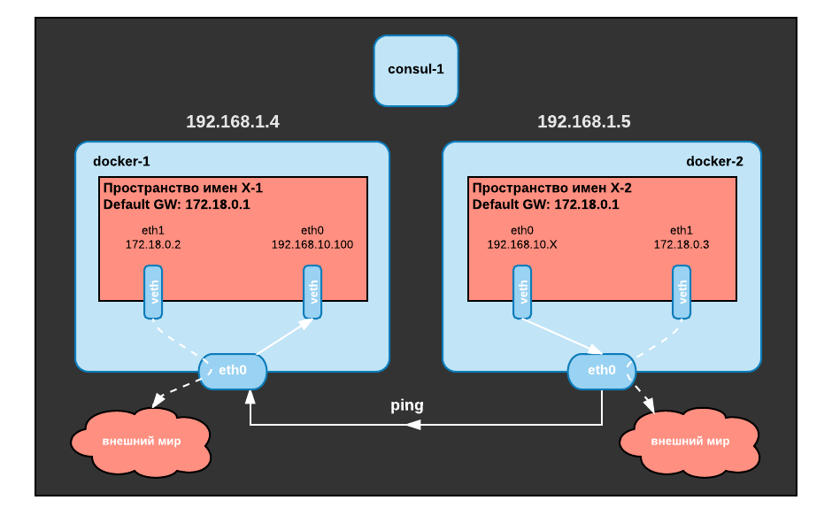 Как видно из примера, пинг между контейнерами проходит. В то же самое время, если попытаться запустить пинг контейнера X-1 с хоста docker-1, на котором этот контейнер запущен, у нас ничего не выйдет: