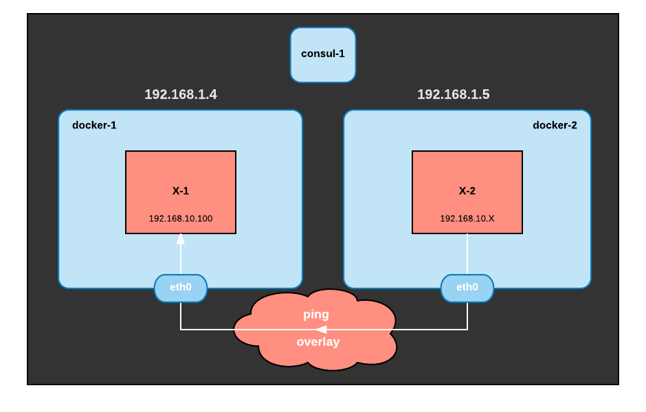 Теперь давайте посмотрим, работает ли наш оверлей. На хосте docker-1 создайте контейнер X-1, подключив его к только что созданной оверлей сети, явно указываем ему IP-адрес (192.168.10.100). На docker-2 мы создаем контейнер, также подключенный к оверлей сети и запускаем команду ping X-1. На хосте docker-1: