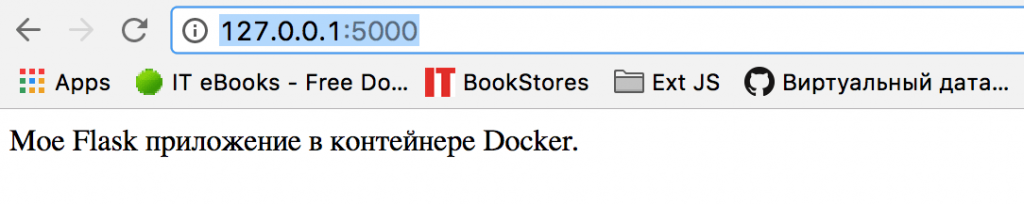 После чего в браузере на странице http://127.0.0.1:5000/ можно будет увидеть строку «Moe Flask приложение в контейнере Docker.»