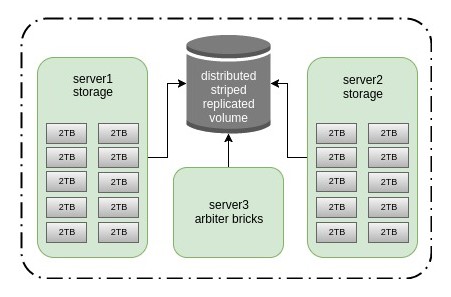Палок для экспериментов у нас хватало с излишком - стойка с Dell Poweredge r510 и пачка не очень шустрых SATA двухтерабайтников, оставшихся у нас по наследству от старого S3. Мы прикинули, что нам не нужно хранилище больше чем на 20тб и после этого нам понадобилось около получаса, чтобы набить в 2 стареньких Dell Power Edge r510 по 10 дисков, выбрать еще 1 сервер для роли арбитра, скачать пакетики и задеплоить его. Получилась вот такая схема.