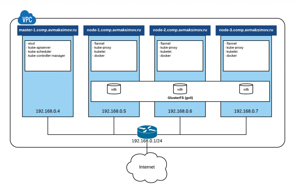 Подразумевается, что у вас уже выполнена установка Kubernetes кластера, т.к. мы начнем сразу с установки кластера GlusterFS на все вычислительные узлы Kubernetes, построенного на CentOS 7. Если установленного кластера у вас еще нет, вы можете быстро это исправить, воспользовавшись статьей "Kubeadm: создание Kubernetes кластера за 10 минут".