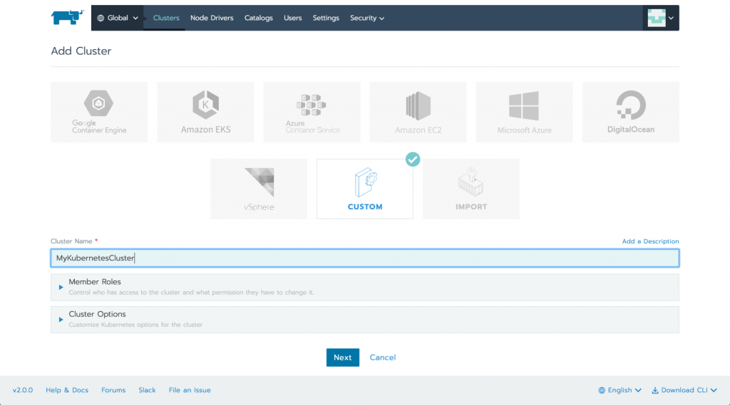 Все, что вам нужно сделать на следующем экране, это определиться с облачной платформой, в которой вы будете разворачивать Kubernetes кластер. Если вы не видите в опциях свою облачную платформу или хостинг, значит, смело выбирайте Custom.