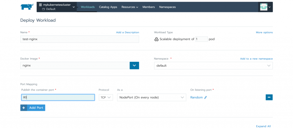 В поле Docker Image указываем Docker образ, находящийся в публичном репозитории, который мы хотим запустить, в моем случае это просто nginx.