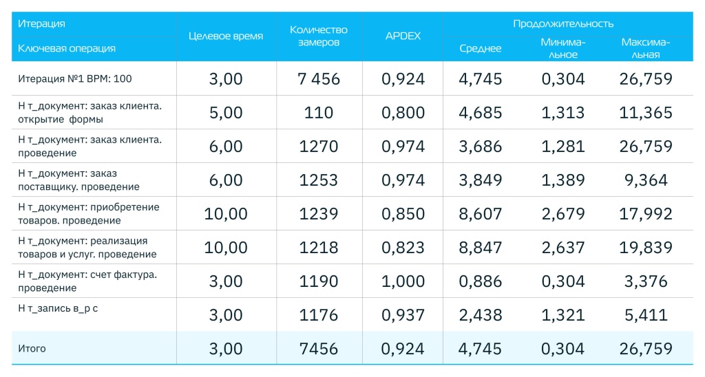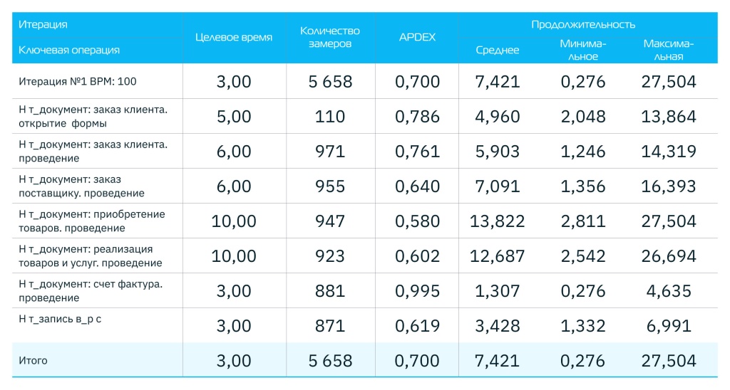 Последний тест был проведен с небольшим отступлением от методики. Классический подход предполагает использование определенного количества виртуальных ядер. Но малое количество высокочастотных ядер по стоимости сравнимо с большим количеством низкочастотных, поэтому было принято решение увеличить количество ядер, уменьшив их частоту. В результате удалось максимально близко подойти к единице по APDEX. В результате не только улучшили показатели, но и развеяли миф о том, что для 1С важна частота процессора.