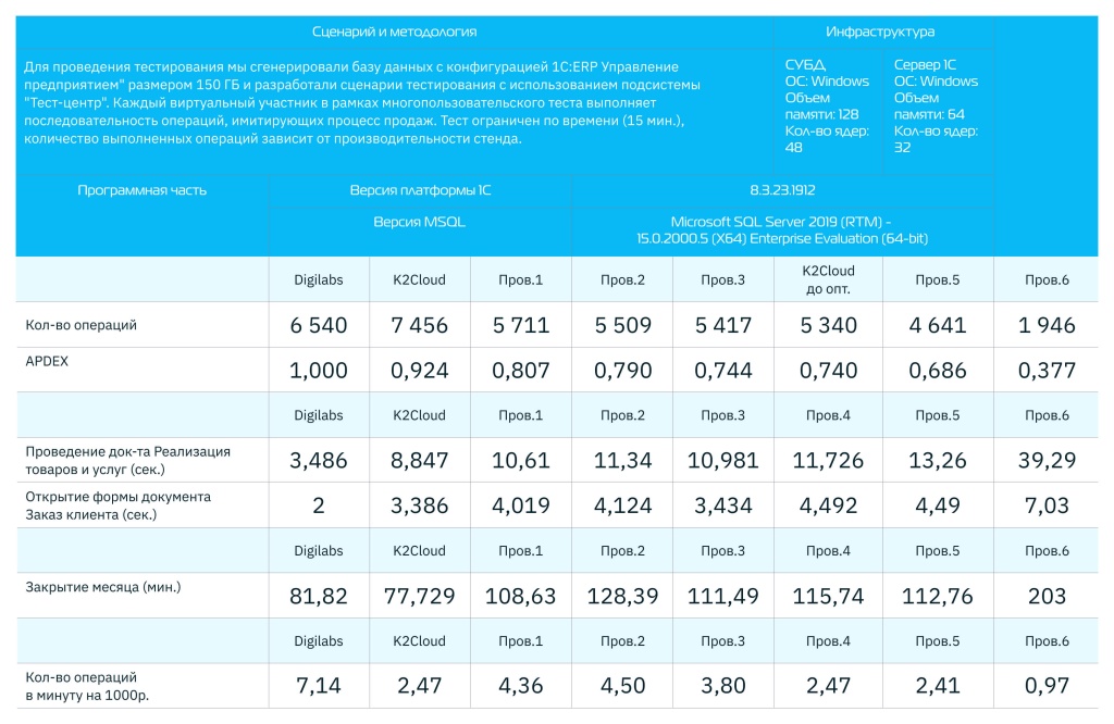 Тест Гилева — это классический интеграционный тест, в основе которого лежит выполнение фиксированного количества определенных операций за отведенное время. Его основным недостатком считается то, что набор операций во время тестирования зачастую далек от того, что происходит в реальной системе у заказчиков. Также, по нашим наблюдениям, этот тест чувствителен только к одной характеристике железа — скорости работы процессора (именно к скорости работы, а не к частоте). Скорость работы дисков тут почти не играет никакой роли. Как результат, применение теста Гилева для оценки облачных провайдеров по сути сводится к измерению скорости работы облачной платформы с процессором. В то же время при реальной эксплуатации систем 1С немаловажную роль играет скорость дисков. Причем важны не только IOPS (input/output operations per second «количество операций ввода-вывода в секунду»), но и скорость обращения в МБ/сек. Однако этот показатель часто выпадает из внимания, поскольку все привыкли смотреть только на IOPS в СУБД.