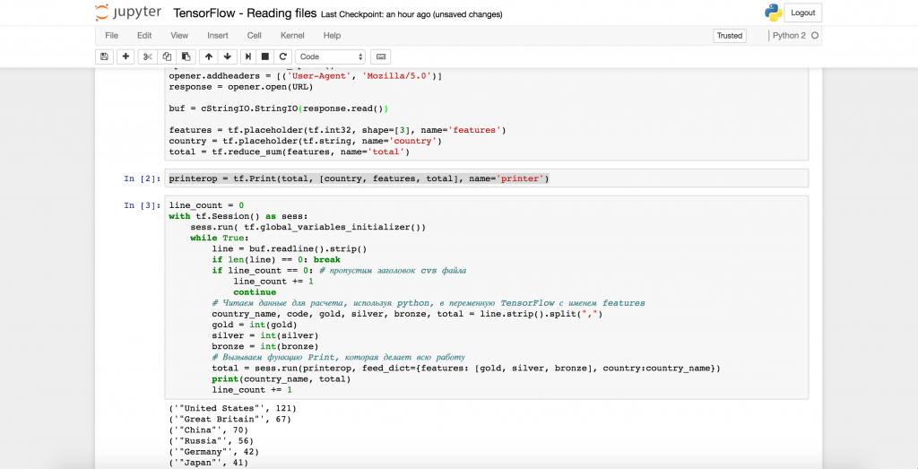 Что происходит, когда мы используем printerop? Эта переменная ссылается на функцию, которая регистрирует текущие значения, переданные ей во втором параметре (в данном случае список [country, features, total]) и возвращает их сумму, применяя к этому списку операцию total. Далее мы открываем сеанс для расчетов графа, открываем файл для чтения и передаем строки из файла функции printerop строка за строкой. Обратите внимание, что чтение файла выполняется исключительно средствами Python во время расчетов в сеансе.