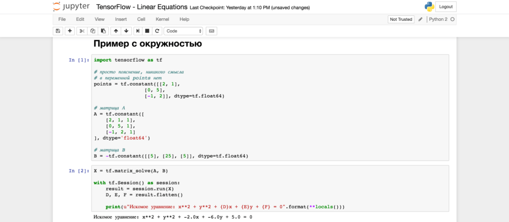 Далее все происходит по аналогии: матрица A состоит из значений x и y со столбцом состоящим из единиц, а наша матрица B будет отрицанием суммы квадратов x и y. Для пояснения пример для TensorFlow: