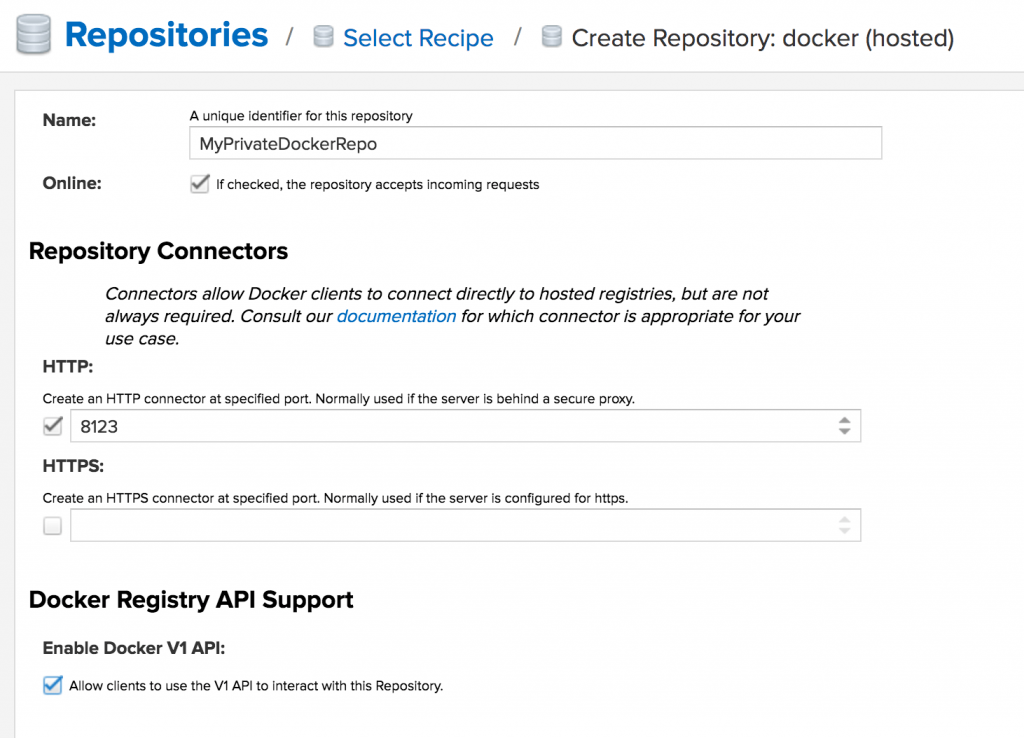Укажите имя репозитория (Name), выставьте порт 8123 (второй экспортированный порт в docker-compose.yml), а также поставьте галочку «Allow clients to use the V1 API to interact with this Repository», если вам нужна поддержка протокола репозитория V1: