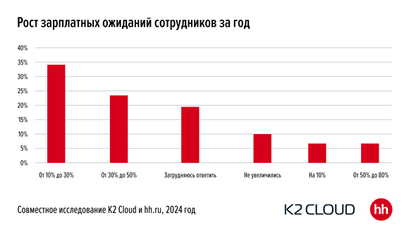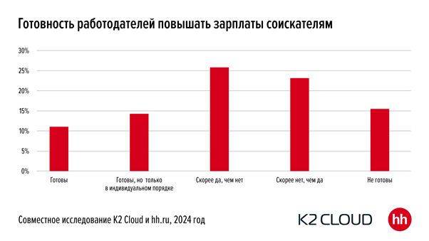 Анализируя готовность компаний платить больше, K2 Cloud и hh.ru выявили переломный тренд перехода от «рынка кандидатов» к «рынку работодателей». Согласно исследованию, перегретый рынок ИТ-специалистов достиг предела и постепенно будет стабилизироваться, поскольку все больше компаний отказывают в таком динамическом повышении зарплат. Почти 40% опрошенных компаний не готовы отвечать возросшим требованиям ИТ-специалистов: 15% категорично отказались повышать оклад, 23% ответили, что вероятнее откажут в «прибавке». Однако 11% респондентов подтвердили готовность увеличить гонорары в ИТ, а 15% сообщили, что принимают подобные решения в индивидуальном порядке.