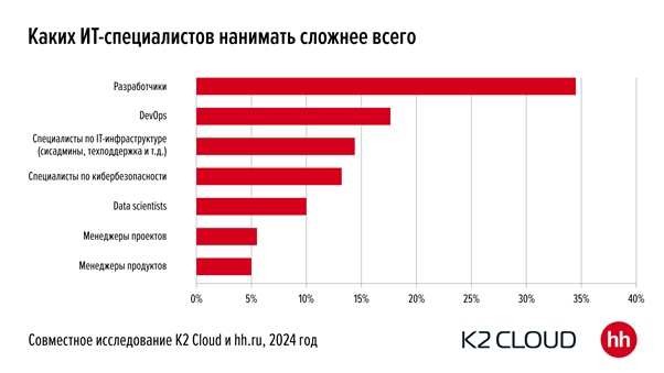 Исследование выявило ТОП специальностей, поиск специалистов по которым может занимать до полугода, согласно данным K2 Cloud и hh.ru. В рейтинг вошли разработчики, DevOps-инженеры, специалисты по ИТ-инфраструктуре (сисадмины, техподдержка и т. д.), специалисты по кибербезопасности, дата-сайентисты, менеджеры проектов и менеджеры продуктов.