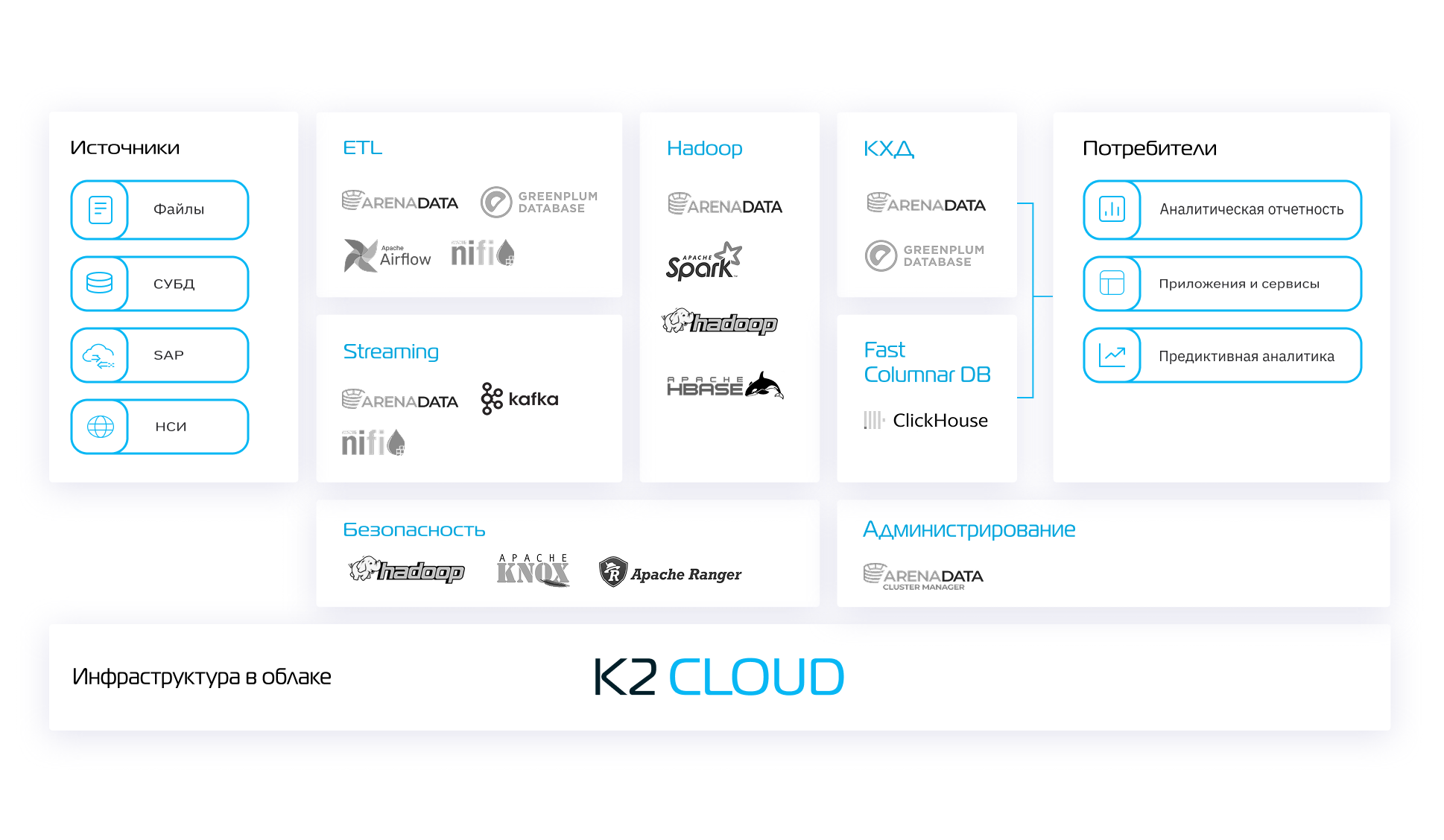 Благодаря бэкграунду интегратора специалисты K2 Cloud обладают компетенциями по всему стеку решений проектов больших данных. Вам не потребуется большой штат data-инженеров для сопровождения решения.